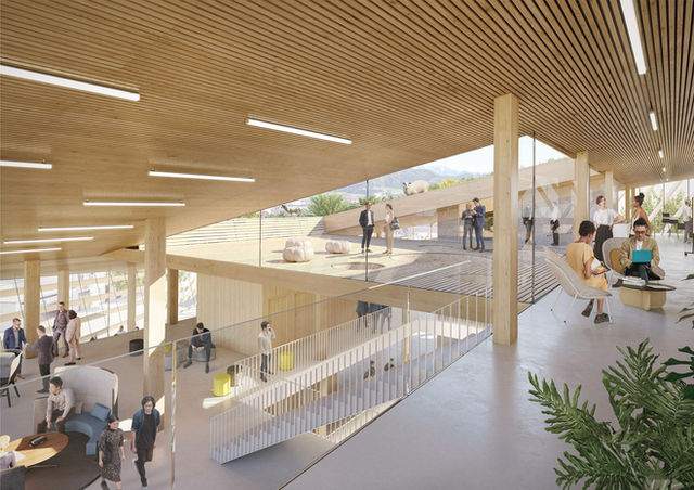 Großzügige Innenhöfe und Atrien sorgen für reichlich natürliche Belichtung im Gebäude. Die Fassade des Neubaus ist dreiseitig mit PV-Paneelen bespielt. Ihre Ausrichtung ermöglicht einen hohen Solarertrag, während sie gleichzeitig als Sonnenschutzelemente dienen. Die Tragwerksstruktur als Holz-Hybrid-Skelettbau vereint ökologische Aspekte mit langfristiger Flexibilität und einem hohen Grad an Vorfertigung.